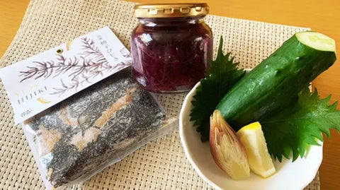 - Thinly slice the cucumber, shiso leaves, and myoga.