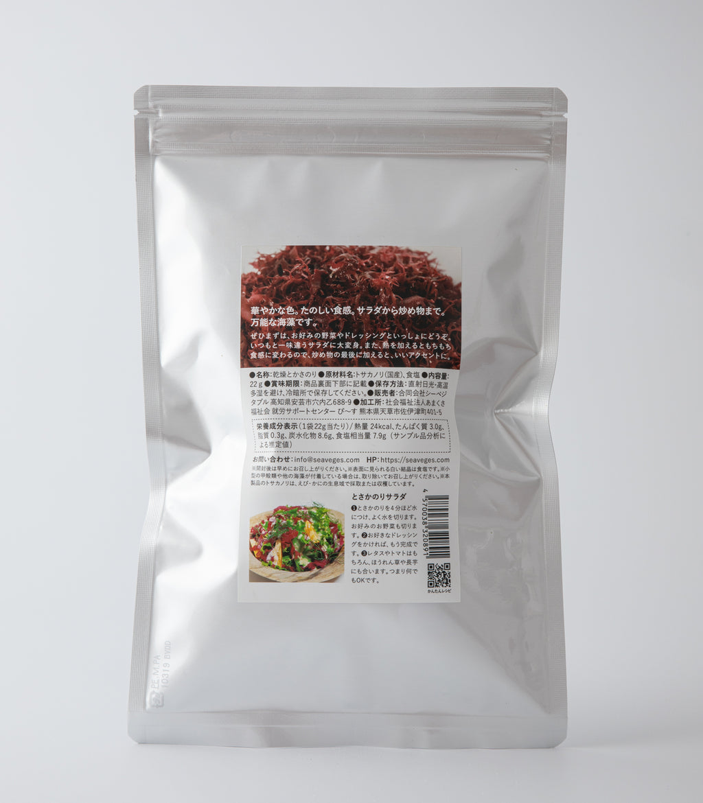 名称:乾燥とさかのり 食べ方:水で4分戻してください。約5~6倍の量になります。 原材料名:トサカノリ(国産)、食塩 内容量:22g / 110g 賞味期限:6ヶ月 保存方法:直射日光・高温多湿 を避け、冷暗所で保存してください。 [栄養成分表示(100gあたり)] 熱量111kcal、たんぱく質13.8g、脂質1.2g、炭水化物39.0g、食塩相当量36.1g *サンプル品分析による推定値 [製造者] 合同会社シーベジタブル 〒 784-0032 高知県安芸市穴内乙 688-9 [加工所] 社会福祉法人あまくさ福祉会 就労サポートセンター ぴ〜す 〒863-2171 熊本県天草市佐伊津町 401-5