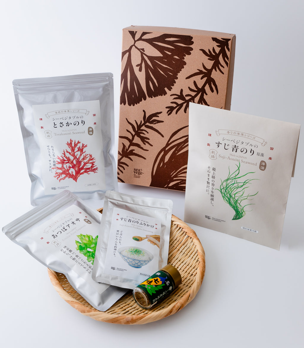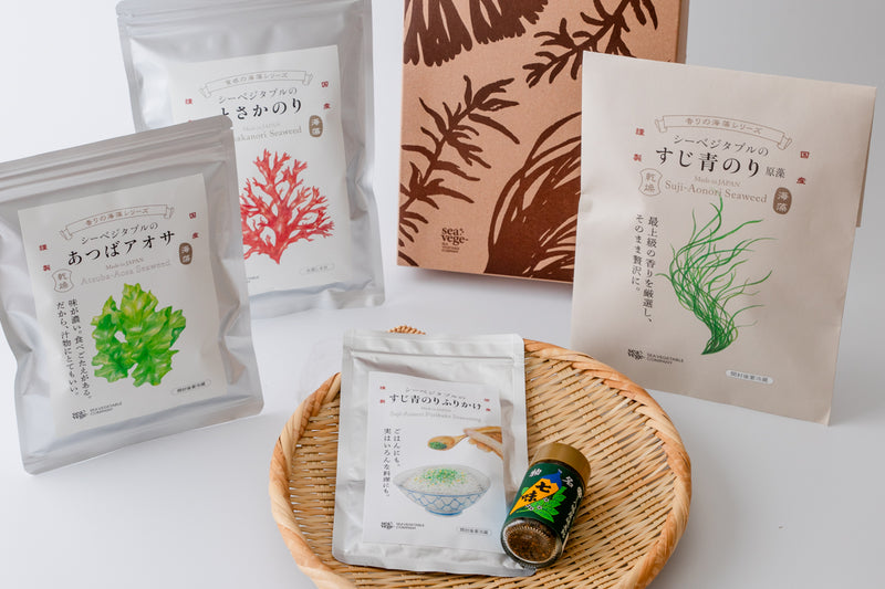 食卓を彩る“海のめぐみ”と、香り豊かなすじ青のり七味の贈りものを。 お味噌汁やサラダ、和え物などに使いやすい、シーベジタブルの人気海藻4種に、老舗〈八幡屋礒五郎〉の「すじ青のり七味」を詰め合わせたギフトセットをご用意しました。 風味や食感の違いを楽しみながら、季節の料理に彩りを添えてお楽しみいただけます。 ご自宅用にはもちろん、手土産やお中元・お歳暮など、贈りものにも最適です。 自然の恵みをそのままに、香り豊かな海藻の魅力をお届けします。